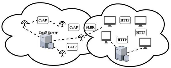 CoAP was proposed by constrained restful environment working group (CORE) in the Internet Engineering Task Force (IETF) [17]. CoAP works for constrained devices at the application layer. For communication, IPV6 over Low Power Personal Area Network (6LoWPAN) provides the usage of IPv6 communication among the sensing devices. IoT devices can communicate in CoAP by using the user datagram protocol (UDP) at the transport layer and 6LoWPAN [18]. Interactions in a constrained network like IoT running CoAP can be either between devices or the client/server, where one of the devices can act as a client and one dedicated device acts as a server [19]. Figure 2 shows the integration of CoAP with the Internet. CoAP itself acts as an internal network, which means that a CoAP client request can only be processed by the CoAP server. CoAP, otherwise, can be extended and can process HTTP client requests using the CoAP/HTTP mapping process, as CoAP acts as a subset of HTTP. The 6LoWPAN border router (6LBR) can be used to establish this connection.