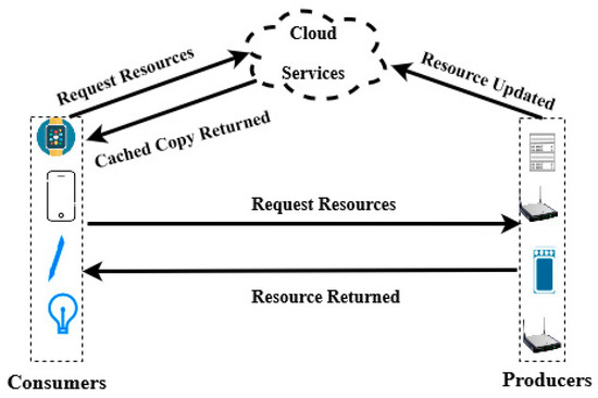 The OSCAR framework works on the consumer–producer model. In IoT, consumers are the end devices, such as accessories used by humans, and the actuating devices that intake data from the producers, such as sensors, smartwatches, smart meters, and motion sensors. The responsibility of offering security in OSCAR lies with the producers. Security is provided to the data at rest or during transmission. The major emphasis of OSCAR is on the object/device security. Global applications, such as smart cities, work on OSCAR, as several consumers/clients are requesting the services of constrained servers [25]. Figure 3 represents the OSCAR framework as the typical consumer–producer model.