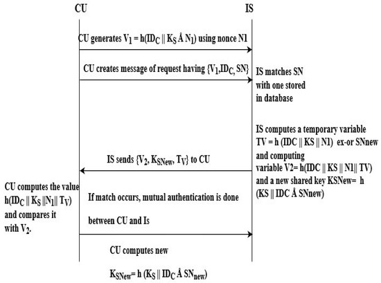 The mutual authentication process starts between CU and IS, where CU first generates a variable computing hash of its identity, a nonce, and an already shared secret key. CU then sends an authentication request consisting of a variable, its ID, and the SN it already has. IS, on receiving the request, first matches the SN received by CU; if a match occurs, IS initiates the process of authentication. For this, IS generates a temporary variable, again using a hash function on the variable received by CU, a secret key and a nonce. CU extracts its variable from a received message from IS. If a match occurs, IS is also authenticated at CU. Once this mutual authentication is done, further data communication starts.