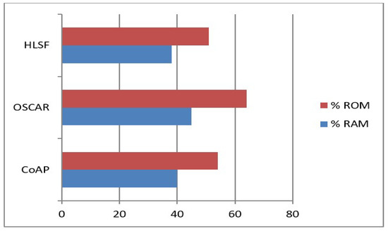 The random-access memory (RAM) and read-only memory (ROM) are evaluated for CoAP, OSCAR, and the proposed HLSF, using COOJA as the simulator. Figure 8 represents the memory requirements in percentage by considering the total available memory in CoAP, OSCAR, and HLSF.