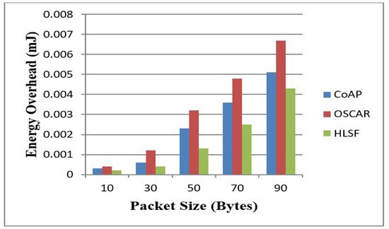 Figure 9 reflects that energy overhead depends on the packet size. With an increase in packet size, energy overhead goes on increasing. Even at the largest packet size, the energy overhead of the proposed HLSF is 18 percent less than CoAP and 55 percent less than OSCAR.
