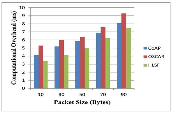 Figure 10 reflects that the computational overhead depends on the packet size. With an increase in packet size, computational overhead goes on increasing. Even at the largest packet size, the computational overhead of proposed HLSF is 8 percent less than CoAP and 24 percent less than OSCAR.