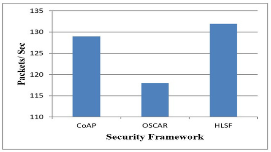 The communications rate is the number of packets sent over in one second. The communication rate is impacted by the type of security framework used for an application scenario. An application that does not offer any security will tend to have a greater communication rate than a security-oriented application. Figure 11 represents the communication rate of CoAP, OSCAR, and HLSF, considering the packet size as 64 bytes.
