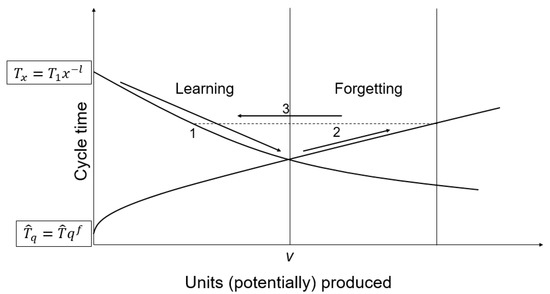 Given the cycle times of the first production cycle, a WLC can be composed by using a regression method. The parameters T1 and l are then known. After the first production cycle, the cumulative experience that was gained is just the amount that was produced during the first cycle time. The break length is considered known and the total forgetting time is a parameter that must be set at the beginning. The forgetting slope is then calculated by Equation (3). can be calculated by