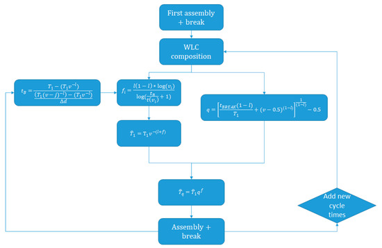 At this point one uncertainty of the initial LFCM is countered, using an existing model. The second dependency of the model are the cycle times of the first production period. In reality, the operator’s cycle times will never exactly follow the WLC and moreover the first production period often has a lot of variation considering completion times due to a large amount of uncertainties [28]. The next step is to use the registered cycle times during all production cycles for adapting the WLC during the process. The equivalent of the cumulative experience gained at the beginning of this cycle is the according value of x in Equation (1) for the predicted time. This value for x, together with the real first task completion time will be added to the data points for the regression. In the same way, a data point for all assembly iterations is added and a new WLC will be obtained.