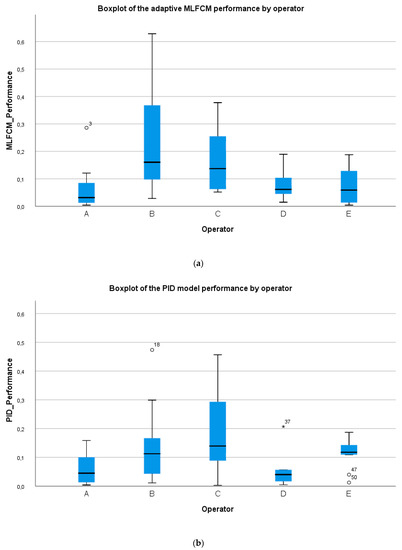 Boxplot of the performance of (a) the MLFCM and (b) PID model.