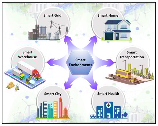 Rapid growth and technological advancements of smart things and devices significantly increased the trend of connecting everyday objects through existing networks [1]. Extensive attention towards connecting objects via the internet pioneered the concept of the Internet of Things (IoT). Transformation of traditional networks and the evolution of Wireless Sensor Networks (WSN), Machine to Machine (M2M) Communication, and Ubiquitous Computing (UC) domains further strengthened the IoT concept [2,3]. The fundamental definition identifies IoT as a network consisting of a collection of uniquely addressable smart things that operate without or with minimal human interaction [4]. These interconnected devices share information among recognized devices within the network, in order to facilitate intelligent decision making [1,5]. As a result of remarkable benefits and extensive attention from expert groups, the IoT concept has evolved rapidly to pioneer various applications i.e., smart home, smart city, smart transportation, smart healthcare, smart grid, etc. [6,7,8,9,10,11]. All aforementioned applications can be commonly named as smart environments. A collection of sensor-enabled devices deployed in a defined geographical area creates a smart environment [12]. Smart environments gather knowledge from their surroundings and intelligibly utilize them to accommodate the requirements of inhabitants, while improving their Quality of Life (QoL). Figure 1 illustrates some of the widely popular IoT-based smart environments.