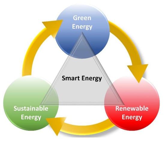 Unceasing population growth and rapid urbanization increased global demand for energy. As mentioned before, various energy management concepts i.e., green energy, sustainable energy, renewable energy, etc. were proposed during the last few decades to address the challenges that arise with increasing energy demand. The utmost goal of the green energy concept was to minimize adverse environmental and societal effects that arise from non-renewable energy utilization [26,27]. Hence, it reduces carbon emissions, greenhouse gas emissions, human health problems, etc., while meeting clean energy demands [28]. The sustainable energy concept was introduced with the goal of preserving and sustaining non-renewable energy sources for the benefit of present and future generations. In general, sustainable energy consolidates both renewable energy generation and energy conservation [29]. Renewable energy is another favored concept that incorporate RESs to fulfill global energy demand. Solar energy, wind energy, and tidal energy are some of the widely used RESs [30]. Over time, the cost of RES has been reduced and continues to decrease further. As shown in Figure 2, smart energy is the holistic approach that combines green, sustainable, and renewable energy concepts.