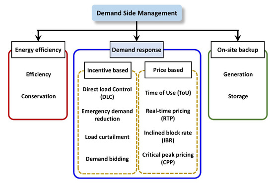 Peak load management is an energy management strategy that aims to mitigate the imbalance between energy demand and supply to reassure power system stability and to minimize tariff volatility over fluctuating demand. Demand Side Management (DSM) is another widely accepted efficient energy management strategy that adjusts energy usage in smart environments to significantly reduce energy wastage, peak load demand, and monetary cost of energy [19,20,21,22]. DSM strategies are categorized into energy-efficient strategies and demand response (DR) strategies [23]. Energy-efficient strategies facilitate minimal energy usage during the operation of a certain system or the production of certain goods and services. Utility energy-efficient programs offer significant monetary benefits to both utility providers and end users. Electricity load variation throughout the day encourages implementation of DR programs. In contrast to energy-efficient programs, DR programs change energy consumption routines. On the one hand, DR strategies change the usage patterns of end users to achieve monetary benefits. On the other hand, they assist utilities by shaving peak load demand [23,24,25]. In general, DR programs are categorized into incentive-based and price-based approaches and these approaches are elaborately discussed in later sections.