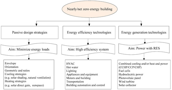 Net-zero energy buildings (NZEBs) have been widely recognized as a promising way to solve the energy crisis and environmental problems. The topic has become so significant that nowadays a range of supporting policies and a financial incentive have been provided for the development of the NZEB in different countries. In Europe, the goal of “nearly net-zero energy buildings” has been established for all the new buildings from 2020 [1]. In the USA, a net-zero energy target for all new residential buildings by 2020 and for all new commercial buildings by 2030 has been set by the California Public Utilities Commission [2]. Substantial research has been conducted on how to design a NZEB in an economic and efficient way. In general, three approaches have been identified to be key factors for achieving NZEB: (1) passive design strategy (e.g., building orientation, cooling/heating strategy) [3,4]; (2) energy efficiency technologies (e.g., HVAC, lighting, and appliances) [5,6]; (3) energy production technologies (e.g., combined cooling, heat and power, battery, photovoltaic panel, and wind turbine) [7,8]. A schematic diagram of the approaches is shown in Figure 1. The literature presents many models on NZEB, for instance, the investigation conducted by Thalfeldt et al. [3] on optimal cost solutions regarding building facade solutions (i.e., the ratio of window-to-wall, external wall insulation, window properties, and shading) for nearly zero energy buildings. Wu et al. [5] investigated HVAC technologies for a residential NZEB in order to achieve the target of energy-saving, cost-effective, and comfortable indoor environment. In the study of Lu et al. [7], the selection of RES was conducted using a single-objective method based on genetic algorithm and multi-objective optimization method based on non-dominated sorting genetic algorithm (NSGA-II) for low/zero energy buildings, respectively. Figure 1 presents a classification of the main approaches to achieve NZEB.