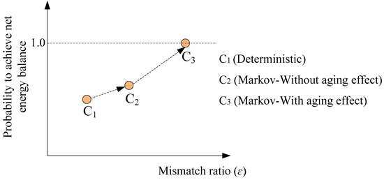 The current studies on NZEB are generally based on the assumption of ideal renewable energy generation, ignoring the impact of aging on the reliability of generation systems. In such cases, the obtained design option (C1) of RES has a lower probability to achieve the expected energy balance during the real application, as shown in Figure 2, where the y-axis indicates the probability to achieve net energy balance and the x-axis is the mismatch ratio. A simple consideration of the reliability assessment of RES is to give a constant availability value for them, which ignores the degradation of the generation system due to aging. Then, the obtained design option (C2) of RES may have a higher probability than that of design option C1, however, it is still lower than the expected value. A more accurate method is to consider the failures of generation systems, where the tendency of failure will increase concerning aging impact. In the third situation, a much larger size of generation systems (C3) may be required whilst it produces an accurate reliability assessment for generation adequacy. In this study, the effect of reliability of generation systems was identified and quantified on the target of net-zero energy balance design.