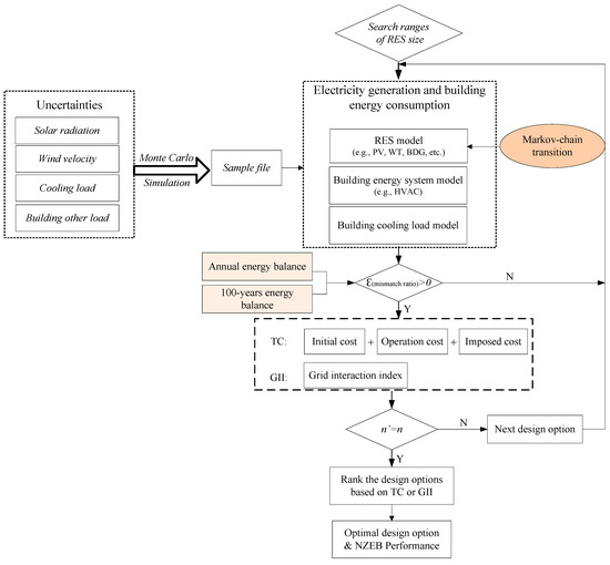 Optimal selection of RES for NZEB is conducted for 100 operation years, and a diagram of the design optimization procedure considering RES reliability with aging features is shown in Figure 3. In the first step, electricity generation models (i.e., RES models) and building energy consumption model (energy system models and cooling load model) were developed. By using a Markov chain, a reliability assessment of renewable energy systems in each year was conducted.