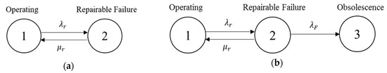 A measure of reliability is the availability of the component, and it is defined as the sum of the probabilities of being in the operating state. For the models given in Figure 4a,b, there is just the operating state (state “1”), therefore, their availability is defined as presented in (9) and (10), respectively.