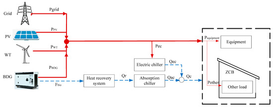 The first zero-carbon building (ZCB) in Hong Kong, China, was used to identify the effect of reliability of RES on design option and corresponding performance. This is a three-story building (area = 1520 m2) with the air-conditioned area of approximately 990 m2. Two types of generation systems, i.e., photovoltaic (PV) of 1015 m2 and a biodiesel generator (BDG) with a rated power of 100 kW, are employed to provide energy for the grid-connected building. In this study, the wind turbine (WT) system was also assumed to be one of the potential generation systems, in addition to PV and BDG. The cooling load of the building was undertaken by three electric chillers, one absorption chiller driven by BDG, and the peak cooling load was about 163 kW. A schematic diagram of the energy systems in the studied building is shown in Figure 6.