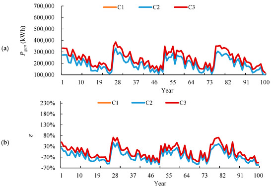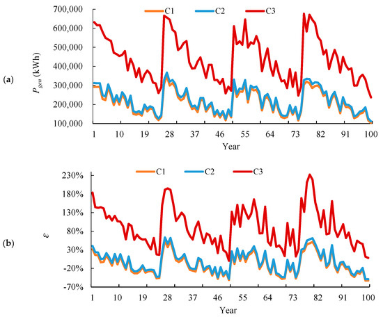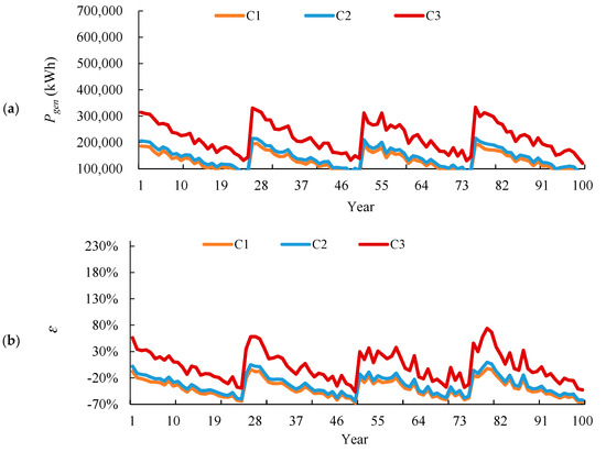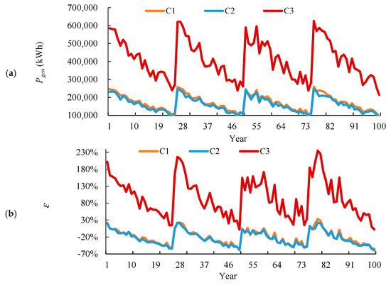 In terms of the 100-years energy balance, the optimal design results are presented in Table 6. For the total cost, the selected options in Case 3 were larger than those in Case 1 and Case 2, but it was reduced from 3600 m2 under annual year balance concerned (Table 5) to 600 m2 under 100-years energy balance. The total cost did not show much reduction in Case 1 and Case 2, however, in Case 3, compared to the annual year balance, the cost was reduced to half. In addition, a remarkable reduction from 92% to 3% was seen in the mismatch ratio in Case 3, indicating a much smaller size was required for the 100-years energy balance. A similar tendency was found for the performance of the grid interaction index. A further comparison of annual energy generation and annual mismatch ratio in the three cases under 100-years energy balance is presented, when the aging effect was taken into consideration, in Figure 11 (regarding ) and Figure 12 (regarding ).