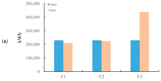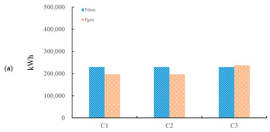 In terms of the total cost, the average values of annual energy generation and annual mismatch ratio were 196,337 kWh and −14.1% (Case 1), 196,377 kWh and −14.1% (Case 2), and 236,652 kWh and 3.6% (Case 3), respectively. In terms of the grid interaction index, the average values of annual energy generation and annual mismatch ratio were 129,719 kWh and −39.3% (Case 1), 143,157 kWh and −33.0% (Case 2), and 218,019 kWh and 2.2% (Case 3), respectively. Following a similar pattern of the annual energy balance, the fluctuations of both parameters showed approximately periodic variations.