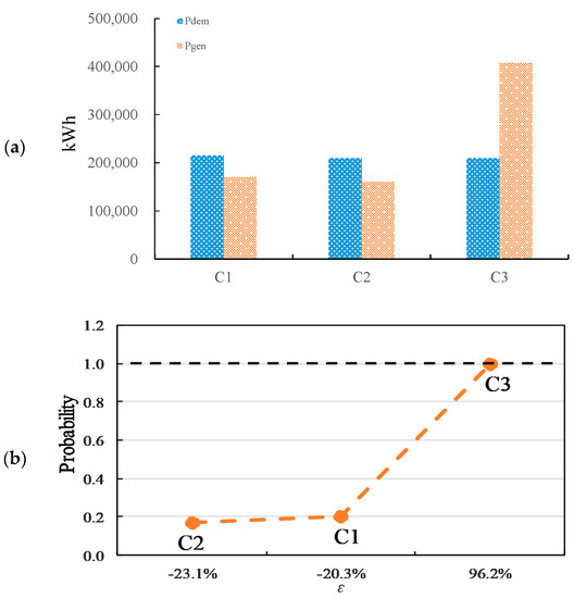 Figure 9 and Figure 10 further present the average annual energy generation of the selected option and the corresponding probability to be NZEB when the aging effect is taken into consideration. It can be seen that the average annual energy generation was less than its energy consumption in Case 1 and Case 2, whilst it was about two times that of energy consumption in Case 3. It was also interesting to find that the probability to be NZEB during practical application was only 0.35 for Case 1 and 0.43 for Case 2 when the total cost was considered, while it was 0.2 for Case 1 and 0.17 for Case 2 when the grid interaction index was considered. Thus, the aging effect had a significant impact on system selection and expected target.