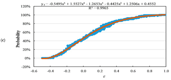 The mismatch ratio of the selected design option has a significant impact on the probability of being NZEB, as indicated in [8] and [12]. Therefore, the selected mismatch ratio can reflect its ability on the NZEB level achieved, which can provide a general perspective for designers. All of the size combinations (945) were investigated in a 100-years operation, and it was interesting to obtain three fitting formulas for the studied three cases, as shown in Figure 15. The coefficients of determination R2 of the three fitting formula were all above 0.98, indicating a good relationship between the mismatch ratio and the probabilities.