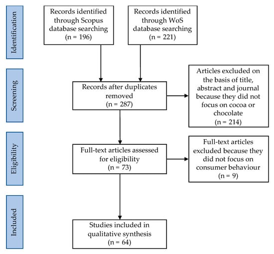 The research conducted on Scopus and Web of Science identified 196 and 221 articles, respectively, for a total of 417 articles. After elimination of duplicates, the remaining 287 articles were first evaluated on the basis of a) abstract, b) title, and c) journal. Then, the original database was reduced to 73 articles, which were analysed in depth by assessing the full text. Studies not in English, not focused on cocoa or chocolate or not related to consumer behaviour were removed. Studies in which chocolate was analysed only as a food ingredient (e.g., chocolate biscuits, chocolate cake or pudding, chocolate milk) were also excluded. As a result, a final set of 64 articles have been identified for an in-depth analysis of the research. A database was then built to analyse key data for each study. The key information included are: (1) author, (2) year of publication, (3) objective, (4) measurement method, (5) sample size, (6) sample composition, (8) data elaboration, (8) main research topics, (9) secondary research topics and (10) country. The description of primary studies included in the review can be found in Supplementary Materials. Thematic groups have been created to categorize the factors of chocolate consumption and purchasing consumer behaviour. This has allowed a clear and detailed understanding of the drivers that influence the chocolate consumer. Future research could build on the gaps highlighted in the current literature review.