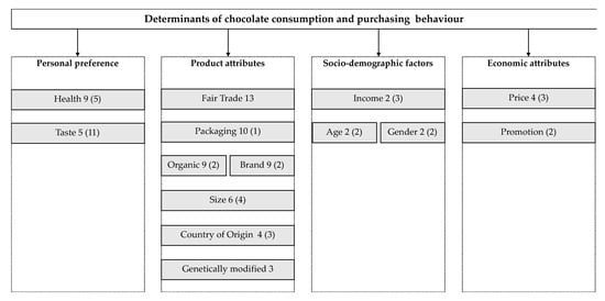Taste and health-related reasons have been included in the category “personal preferences”, which influence chocolate consumer behaviour. “Product attributes”, which have been divided into Fair Trade, packaging, organic, brand, size, country of origin and genetic modification, affect the type of chocolate consumed. Furthermore, price and promotions, included in the “economic attributes” category, determine consumer purchasing behaviour. Finally, the influence of age, gender and income on consumers’ preferences have been grouped in the “socio-demographic factors” category.