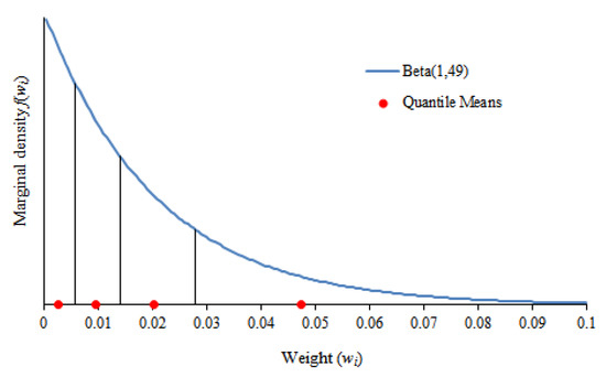 where and are the lower and upper bounds, respectively, of the k-th quantile of Beta(). An illustration of the resulting scores is shown in Figure 1 with and . As a reminder, when , that does not mean . The scores must still be normalized as shown in Equation (3); could be considered the raw weight associated with tier k. Though Equation (4) may appear cumbersome, it is a straightforward spreadsheet calculation.