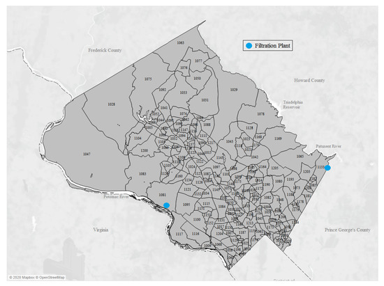 In this section, we apply the weight approximation methods to illustrative preferences regarding total water usage by census block in Montgomery County, which is located in the United States adjacent to Washington, D.C., in the state of Maryland. There are 215 blocks in total; the map is shown in Figure 2, with many of the blocks labeled, and the primary water provider’s two filtration plants shown in blue. These preferences would apply to any regulatory or development decisions in Montgomery County for which impact on water usage is the primary concern.
