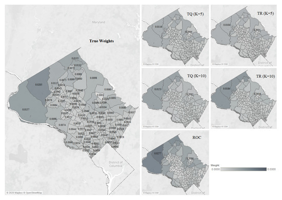 The MSE for each method is shown in Table 4. The two most accurate methods, by a wide margin, are TQ and TR. As expected, RR and ROC do not perform well. Maps of the approximated weights for TQ and TR are shown in Figure 3. For the sake of readability, labels are only included for the maximum and minimum weights. ROC is also included in Figure 3 to illustrate why it is less accurate in this example; it assigns too many very large and very small weights. Note that the tier-based methods err slightly in the opposite direction (especially for ), as their highest and lowest weights are less extreme than the true weights.