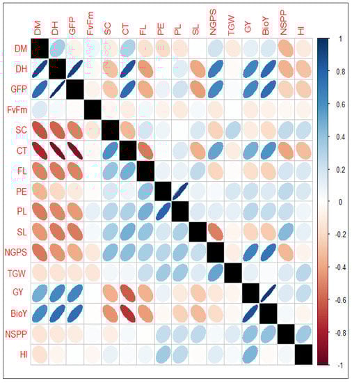 Heatmap indicating associations among different agronomic and morpho-physiological traits under control (upper diagonal) and drought (lower diagonal) conditions. The thickness of each ellipse indicates the correlation intensity between two traits. DH: days to heading; DH: days to heading; DM: days to maturity; GFP: grain filling period; PL: plant height (cm); PE: peduncle length (cm); FL: flag leaf length (cm); SL: spike length (cm); NSPP: number of spike per plot; NGPS: number of grains per spike; TGW: thousand grains weight (g); GY: grain yield (g plot−1); Bio: biomass (g plot−1); HI: harvest index; Fv/Fm: maximum quantum yield of PSII; SC: stomatal conductance (mmol m−2 s−1); CT: canopy temperature (°C).