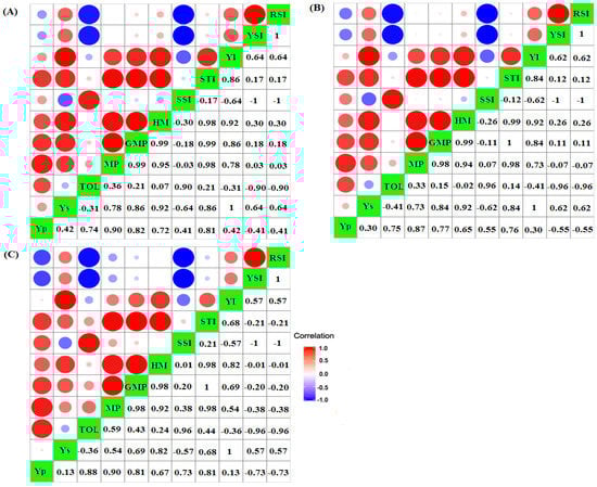 Heatmap indicating the association among different yield-based drought tolerance and susceptibility indices in the first year (A), second year (B), and average over two years (C). The size of each circle indicates the correlation intensity between two indices.
