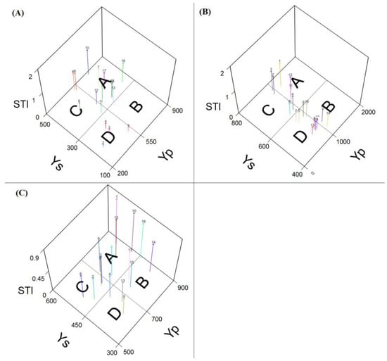 Three-dimensional plot rendered based on grain yield under control (Yp), grain yield under drought condition (Ys), and STI index based on data obtained in the first year (A), second year (B), and average over two years (C).