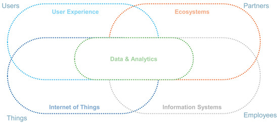 Gansen et al. argued that a digital platform is supported by five convergent, integrated, and horizontal technical systems from a technical perspective, as shown in Figure 4. User experience technology deals with customer-facing components, while ecosystem technology supports the creation and connection of external ecosystems, the marketplace, and the community. Data analytic technology includes information management and artificial intelligence. Finally, IoT connects physical assets for monitoring, optimization, control, and profit. Information systems support the operation of the back office, enterprise resource planning (ERP), and core systems [2].