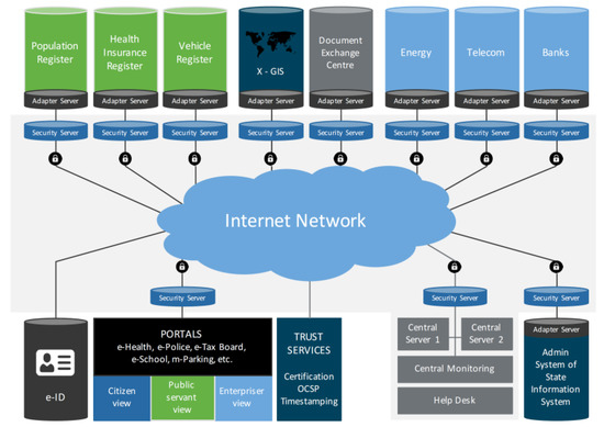 Estonia decided that the online economy and massive technological innovation were the way to move on with no natural resources and low population in the 1990s. Estonia has now occupied a rank as a small but influential country of the information society due to this effort. Estonia is considered the first country to realize GaaP on account of using X-road that has contributed to building a digital community of Estonia (Figure 6). X-Road is a system of registries whereby each has an authorized owner of the data responsible for its maintenance and security. The system relies on a unique 16-digit personal identifier for every person to retrieve personal data from any registry and several other identifiers for businesses, properties, vehicles, and so on. The result is similar to a peer-to-peer network [46]. After Estonia’s experience with the 2007 cyber-attacks from Russian hackers, X-road adopted blockchain technology to ensure data integrity in government repositories and to protect the country’s data [47]. Now more than 1000 organizations and enterprises in Estonia are using X-road daily in more than 1700 services. With the introduction of X road, 99% of state services are online, and 844 years of working time have been saved thanks to data exchange. Based on the GaaP, Estonia can provide various public services, including e-Police and e-Business that links to a data registry of all legal entities registered in Estonia. For example, an Estonian government portal allows online company registration for new businesses and non-profits. The I-Voting portal enables voters to cast ballots online from any location, while e-Health integrates data from different healthcare providers to provide a comprehensive record for each patient that can be viewed by both doctors and patients; there is also e-School, and so on [46].