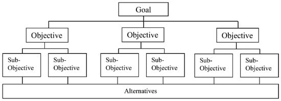 Saaty introduced the AHP as a multi-criteria decision-making approach in the 1970s. The AHP is a decision-support tool which can be used to solve complex decision problems [49,50]. AHP uses a hierarchical structure of goal, objective, sub-objective and alternative, as shown in Figure 7 [51,52].