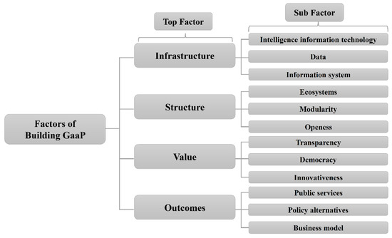A national informatization strategy committee sorted infrastructure, governance, and services as components of GaaP. Infrastructure involves a cooperative culture of public officers, fundamental technology for platforms, and open data utilization, while governance comes up with policy suggestions and policy decision-making processes. Services include major subject area platforms and services for the private sector [34].