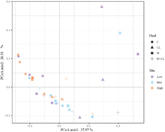 The PCoA ranking analysis in Figure 1 showed that the contribution rates of the first two axes were 37.97% and 26.51%, respectively; four different experimental treatments of the alpine Kobresia meadow were clearly separated in the ranking diagram.