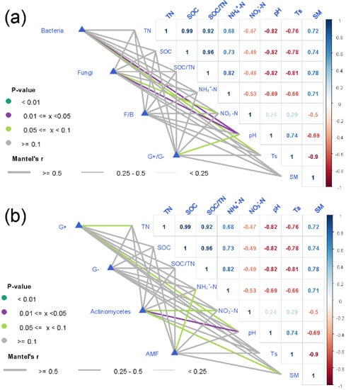 The contents of total PLFA, fungi, bacteria, G+, G−, and actinomycetes were positively related to NH4+-N (Table A1). Mantel test showed that the composition of soil bacteria was correlated with pH at p < 0.05 and Ts at p < 0.10. The composition of soil fungi was correlated with pH at p < 0.05 and with NO3−-N at p < 0.10. The G+/G− was correlated with soil pH at p < 0.10 (Figure 2a, Table A3). The composition of G+ was correlated with soil TN and pH at p < 0.10. The composition of actinomycetes was correlated with pH at p < 0.05 and with NO3−-N and SM at p < 0.10. The content of AMF was correlated with NH4+-N at p < 0.10 (Figure 2b, Table A3).