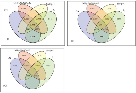 The Ts alone explained 14.6% variance of the soil total PLFA community, and interaction with other factors explained 10.9% variation of the soil total PLFA community. That is, Ts combined explained 25.5% variation of the soil total PLFA community. The SM and pH explained 12.4% variance of the soil total PLFA community without interaction with other factors; interacting with other factors explained 9.0% variation of the soil total PLFA community. That is, the SM and pH combined explained 21.4% variation of the soil total PLFA community. The soil available nitrogen content (NH4+-N and NO3−-N) alone explained 3.8% variance of the total PLFA community; interacting with other factors explained 10.6% variation of the soil total PLFA community. That is, the total soil available nitrogen explained 14.4% variation of the soil total PLFA community. Soil carbon and nitrogen (TN, SOC, C: N) and other factors interacted to explain 3.5% variance of the PLFA community (Figure 3a). The Ts alone explained 13.7% variance of the soil bacterial community, and interaction with other factors explained 10.6% variation of the soil bacterial community. That is, the Ts combined explained 24.3% variation of the soil bacterial community. The SM and pH explained 10.2% variance of the soil bacterial community without interaction with other factors; interacting with other factors explained 8.8% variation of the soil bacterial community. That is, SM and pH combined explained 19.0% variation. The soil available nitrogen content (NH4+-N and NO3−-N) alone explained 3.3% variance of the soil bacterial community; interacting with other factors explained 10.3% variation of the soil bacterial community. That is, the total soil available nitrogen content explained 13.6% variation of the soil bacterial community. Soil carbon and nitrogen (TN, SOC, C: N) and other factors interacted to explain 3.7% variance of the bacterial community (Figure 3b). The Ts alone explained 26.7% variance, and interaction with other factors explained 28.4% of the variation of the soil bacterial community. That is, the Ts combined explained 55.1% of the variation of the soil bacterial community. The SM and pH explained 34.1% variance of the soil fungi community without interaction with other factors; interacting with other factors explained 27.9% variation of the soil fungi community. That is, the SM and pH combined explained 62.0% variation of the soil fungi community. The soil available nitrogen content (NH4+-N and NO3−-N) alone explained 13.4% variance of the soil fungi community; interacting with other factors explained 27.2% variation of the soil fungi community. That is, the total soil available nitrogen content explained 40.6% variation of the soil fungi community. Soil carbon and nitrogen (TN, SOC, C: N) alone explained 4.1% variance of the soil fungi community, and interaction with other factors explained 16.2% variation of the soil fungi community. That is, the Ts combined explained 17.3% variation of the soil fungi community (Figure 3c).