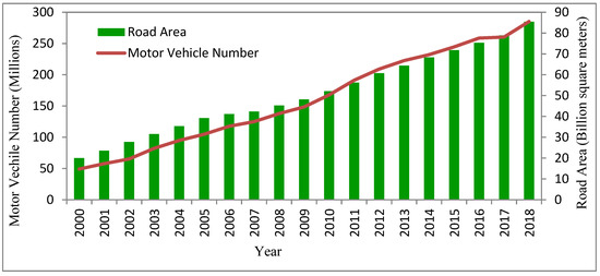 Data from the World Bank show that the proportion of the world’s urban population rose from 46.69% in 2000 to 55.27% in 2018, an increase of 8.58% In the rapid development of urbanization, the rapid population concentration and the population increase have resulted in an increase in the demand for commuting travel and logistics transportation. Therefore, pollution caused by motor vehicle exhaust has become one of the main sources of urban air pollution [1]. In 2019, the 2018 World Air Quality Report published on Air Visual showed that 89% of cities in China have exceeded the global air quality standard. The relatively backward construction of public transport infrastructure will lead to traffic congestion and other urban maladies, further aggravating the air pollution caused by traffic circulation. The Wind database indicates that the average annual growth rate of motor vehicle numbers was 10.96% from 2000 to 2017, while the road area growth rate during the same period was only 8.04% in China, as shown in Figure 1. The growth rate of vehicle consumption is higher than the growth rate of road construction. The vehicle growth causes slow speed and congestion, which will result in the fuel combusting insufficiently, and the pollutants from the exhaust gas are 2–3 times higher than that during normal driving [2]. Traffic congestion exacerbates urban air pollution, therefore, improving the traffic environment is an effective way to improve urban air quality [3].