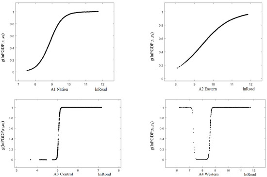 In the fourth column of Table 4, the position parameter is 6.05 and the conversion slope is 18.85 for the western city samples. When the GDP per capita is greater than RMB exp (6.05) = 425, the model changes from the lower regime state to the upper regime state. As can be seen from A4 in Figure 3, the conversion slope in the western region is also larger. The coefficient of road area per capita to air pollution approaches 0.01 in the lower regime state, but approaches 0.02 in the upper regime state. In other words, the coefficient is always positive whether the model is in the lower or upper regime. However, the coefficient is not significant.
