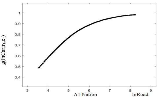 In the third column of Table 4, the position parameter is 8.59 and the conversion slope is 37.50 for the central city samples. In other words, when the GDP per capita is greater than RMB exp (8.59) = 5394, the model will change from the lower regime state to the upper regime state. When the GDP per capita is lower than RMB 5394, the model will move closer to the lower regime state. The slope in the central region is the largest. As can be seen from A3 in Figure 3, the conversion trend is more intense. In the lower regime state, the coefficient of road area per capita to air pollution approaches 0.25, while the estimated coefficient approaches 0.07 (all are positive) in the upper regime state. In the upper regime state, the parameters are negative. Of the sample cities, 1536 are above the position parameter, accounting for 92.76% of the total sample. This indicates that a negative correlation is shown between the road area per capita and air pollution to a great extent in the central region.