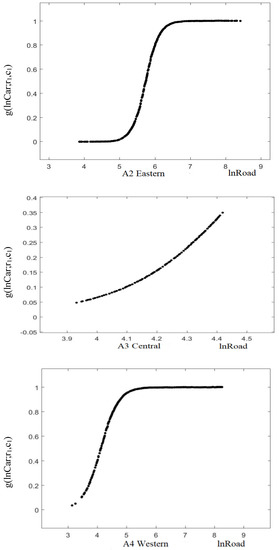 Regional samples: In the second column of Table 4, the position parameter is 9.39 and the conversion slope is 1.29 for the eastern city samples. In other words, when the GDP per capita is greater than RMB exp (9.39) = 11,908, the model gradually moves closer to the upper regime state with the increase of the conversion variable. If the GDP per capita is lower than RMB 11,908, the model gradually moves closer to the lower regime state. The coefficient of road area per capita to urban air pollution approaches 0.14 when the GDP per capita is in the lower regime state, while the estimated coefficient of road area per capita approaches −0.03 from positive to negative in the upper regime state. This shows that the correlation between road area per capita and air pollution is approaching −0.13 from 0.14, and the increase in road area has played a role in suppressing air pollution as the GDP per capita increases. Compared to other city samples, their conversion slope is the lowest. As can be seen from A2 in Figure 3, the slope of the curve is relatively gentle. In addition, in the 1908 eastern sample cities, only 371 values are lower than the position parameter, accounting for 19.45%. This indicates that a negative correlation is shown between the two, to a great extent.