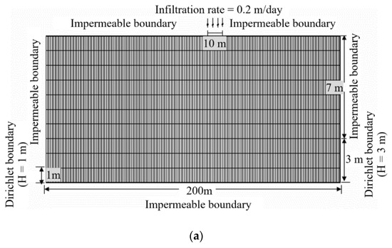 where is the moisture content distribution at the initial time . Here, at the Neumann and impermeable boundaries, respectively, and are known a priori, i.e., prescribed with known values. Accordingly, if the flux through a Dirichlet boundary can be calculated exactly and the finite element hydraulic solutions obtained from Equations (19), (20), or (29) are free of error, the mass balance equation (Equation (30)) will be perfectly satisfied, assuming that the numerical quadrature is exact and there is no temporal discretization error. The flux through the Dirichlet boundary can be conventionally calculated by either differentiating the hydraulic heads computed from Equation (19) or (20) using the CDA, or by applying the finite element approach to the Darcy equation with the hydraulic heads computed from Equation (19) or (20) using Yeh’s approach. However, the approach proposed in this study directly calculates the flux through Dirichlet boundaries by solving Equation (29) for Galerkin fluxes or integral boundary fluxes at the Dirichlet nodes. To illustrate the superiority of the mass balance computation performed using the proposed approach, here, the approach was compared to the CDA and Yeh’s approach using two practical groundwater scenarios.