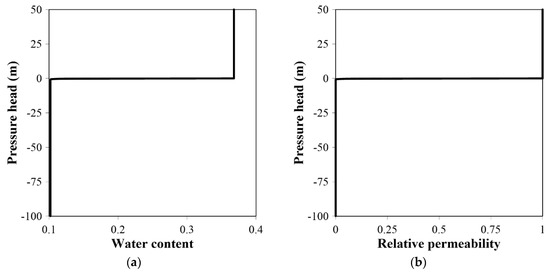Curves of constitutive relations associating the pressure head with (a) the water content and (b) the relative permeability.