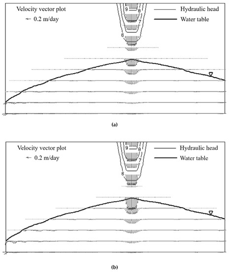 The Galerkin finite element method (FEM) has long been used to solve groundwater flow and advection–dispersion–reaction equations to predict groundwater flow and the transport of pollutants in porous media. Popular commercial simulation programs, such as FEMWATER [1], FEFLOW [2], and HYDRUS3D [3], were developed based on the Galerkin FEM, and programs such as these have been widely used for some time. In these commercial software packages, Galerkin FEM is used to solve the governing equation of groundwater flow subject to appropriate boundary and initial conditions. The governing equation is simply a statement of a water mass conservation equation coupled with constitutive relations, such as Darcy’s law. In this conventional FEM formulation, the pressure or hydraulic head distribution is obtained and a velocity field is subsequently calculated using Darcy’s law by taking the derivatives of the calculated pressure head distribution, which is used as either the advection velocity for calculating the contaminant transport or the flow through a boundary for calculating the water mass balance. This approach toward obtaining the velocity field is denoted here as the conventional differential approach (CDA). However, the calculated velocity field using the CDA often contains velocity discontinuities at nodal points and element boundaries. Such discontinuities unfortunately lead to large errors when solving the contaminant transport equation. In addition, discontinuities can also lead to failure to conserve the water mass in mass balance computations. The CDA was included in the HYDRUS software.