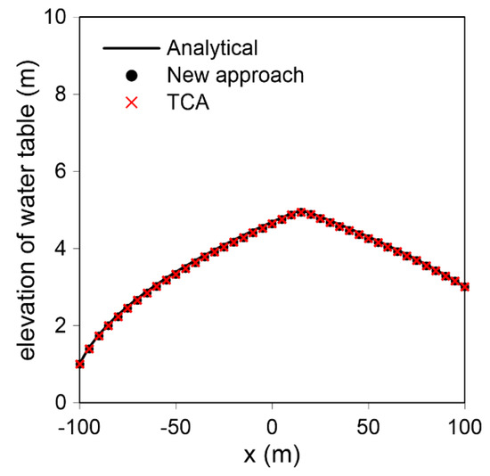 where is the computed water table at location and is the analytical solution of Equation (35) at location . According to Figure 5, the water table profiles computed using the new method to solve Equation (29) and using the TCA to solve Equations (19) or (20) were identical. Indeed, we found good agreement between the two results, regardless of the mesh discretization level (not shown). However, the maximum difference increased with increasing element size in both approaches, as shown in Table 3.