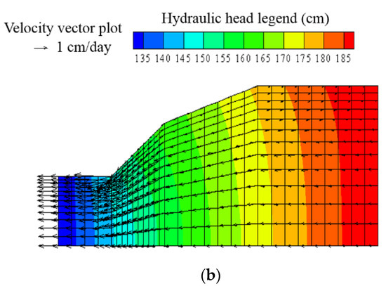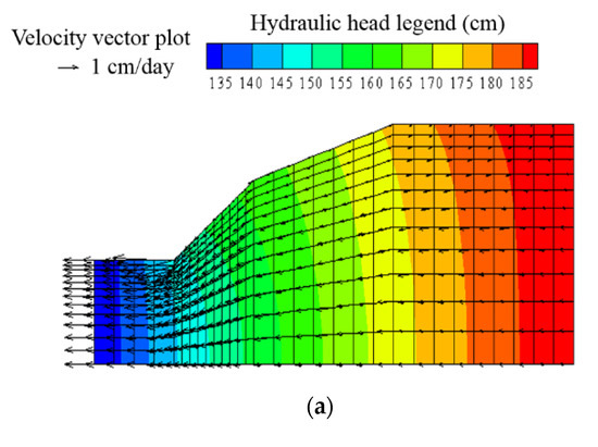where , , and represent the saturated water content, the residual water content, and a soil index parameter related to the pore-size distribution, respectively. The Darcy velocity can be calculated using: