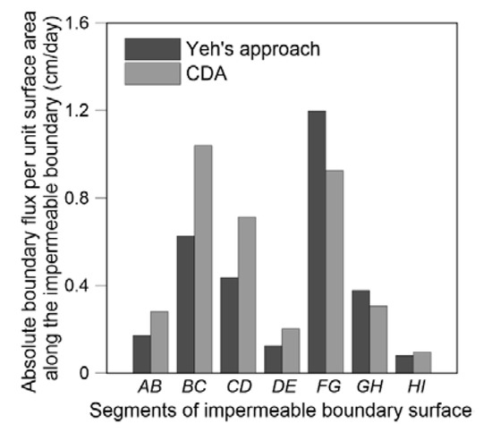 Yeh [4] demonstrated water balance errors in the range of 24–30% for a complex problem due to discontinuities in the computed Darcy flux in the interior of the domain. An alternative postprocessing approach was proposed, which provides a continuous Darcy flux by applying the finite element approach used to simulate the groundwater head field to the Darcy equation, with the fluxes as the state variables. Yeh reported that the global mass balance errors could be reduced from 23.8% to 2.2% when this postprocessing approach was used rather than the CDA. Yeh’s postprocessing approach is already included in the FEMWATER software and several other studies have applied it to a range of groundwater flow and transport simulation problems [5,6,7,8,9,10].