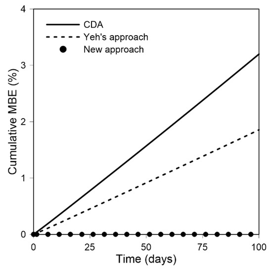 Comparison of cumulative mass balance errors (MBEs) as a function of the time calculated for the new approach, Yeh’s approach, and CDA.