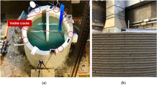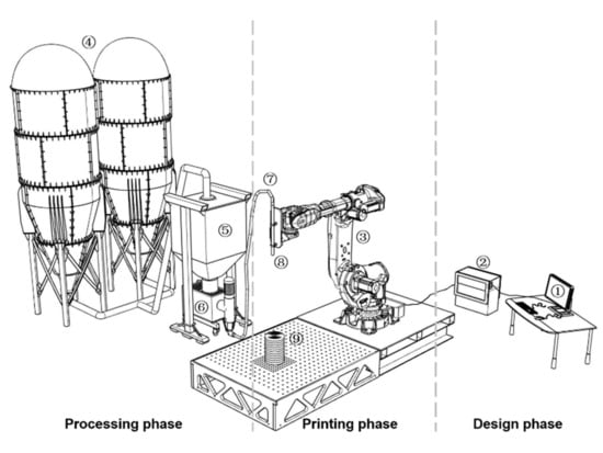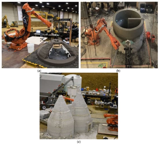For the exploration of both on-site and off-site large-scale manufacturing applications, this paper focuses exclusively on the extrusion-based printing process, another typical 3D-printing technique in automated construction, which extrudes printable cementitious materials layer by layer in the form of filaments from a nozzle mounted on a robotic control system (shown in Figure 1). Examples like Contour Crafting [,,], Concrete Printing [,], CONPrint3D [], and the PennStateDen@Mars Project [,,,,] (see Figure 2) illustrate the potential use of extrusion-based printing technology for large-scale freeform construction. However, there are some concerns about the quality of printable mixtures, which are quite different from cast-in-place concrete.
