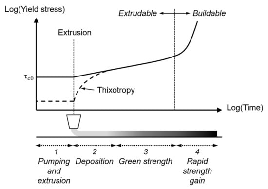 - Stage 2: Once extruded and deposited, cementitious materials show intrinsic structural build-up. Cement particles tend to flocculate and form a network of interacting particles as colloidal attractive forces dominate []. The evolution of yield stress and elasticity in this stage is negligible. The structural build-up rate after deposition can be modified by the use of flocculation or thixotropic agents like clays [,,], which lower the initial yield stress but accelerate its evolution over time (particularly after deposition, as shown by the dashed line in Figure 4).